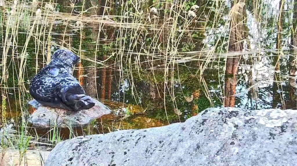 Anders als der Adler, der die ganze Zeit „Zuhause“ ist, muss man bei der Saimaa-Robbe warten. Die Wildtierkamera richtet sich auf einen Stein, auf dem sich die Robbe besonders gerne sonnt. Vielleicht klappt es und ihr erwischt sie. Ihr findet sie hier. Viel Glück!