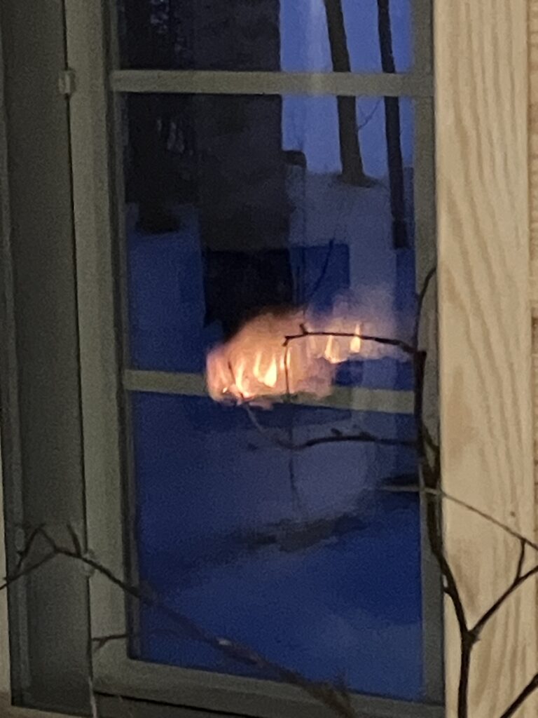 Früh am Morgen - im Fenster spiegelt sich das Kaminfeuer